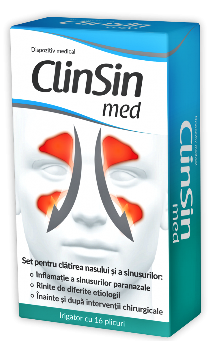 ClinSin Med is a practical set containing 16 saline sachets and an easy-to-use irrigator, designed for effective rinsing of the nasal cavities and sinuses.