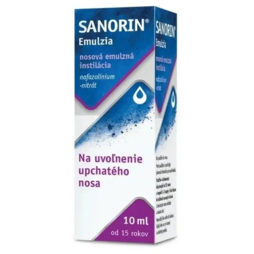 Sanorin emulsion 1 mg/ml nasal drops, emulsion 1 × 10 ml, Sanorin emulsion contains 1 mg of naphazoline hydrochloride per ml and is used as a nasal decongestant to relieve nasal congestion caused by colds, sinusitis, or allergies.