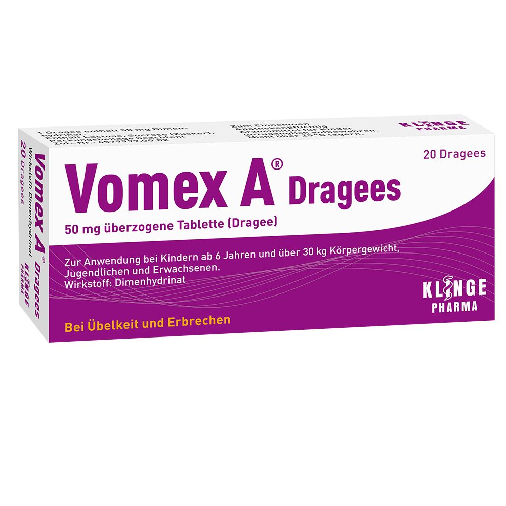 Vomex A coated tablets 50 mg contain dimenhydrinate, a medication widely used to prevent and treat nausea, vomiting, and dizziness caused by motion sickness or inner ear problems.